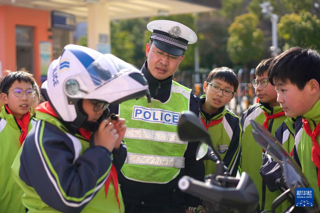 2月13日,浙江省岱山县公安局交通警察大队辅警在辖区高亭小学向学生讲解如何正确佩戴安全头盔。