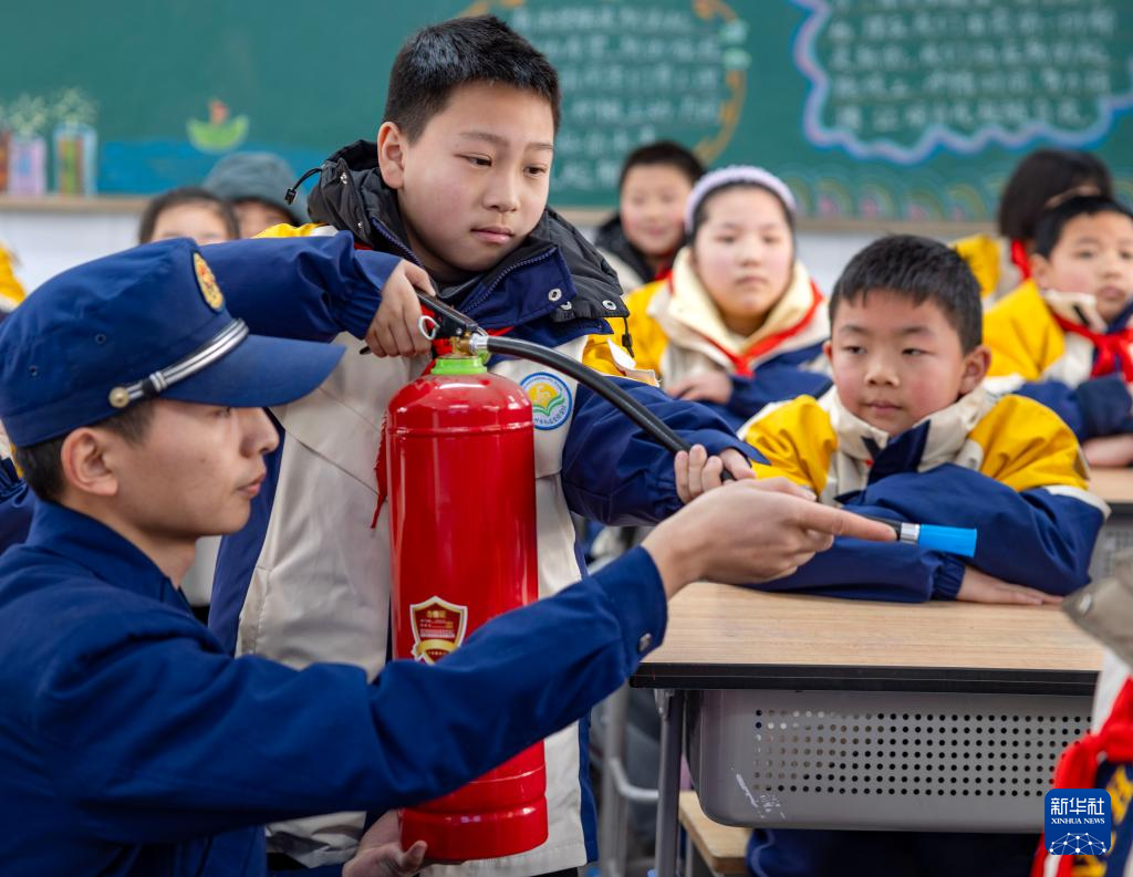 2月13日,在四川省达州市达川区实验学校,消防员在指导孩子们使用消防水枪。