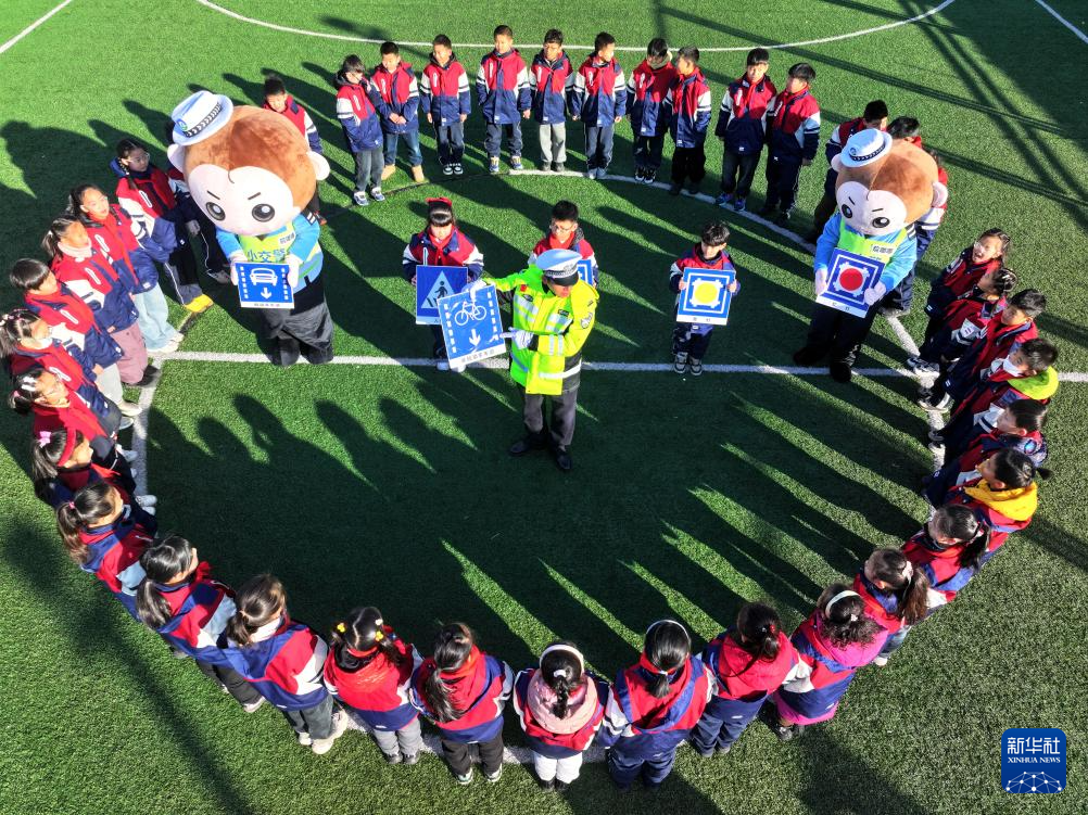 2月13日,在江苏省连云港市院前小学,交警为学生讲解交通安全知识(无人机照片)。