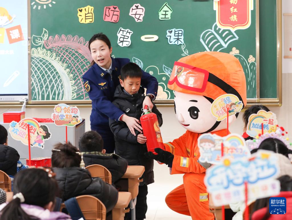 2月13日,消防员在江苏淮安生态文化旅游区沁春路小学给学生讲解消防安全知识。