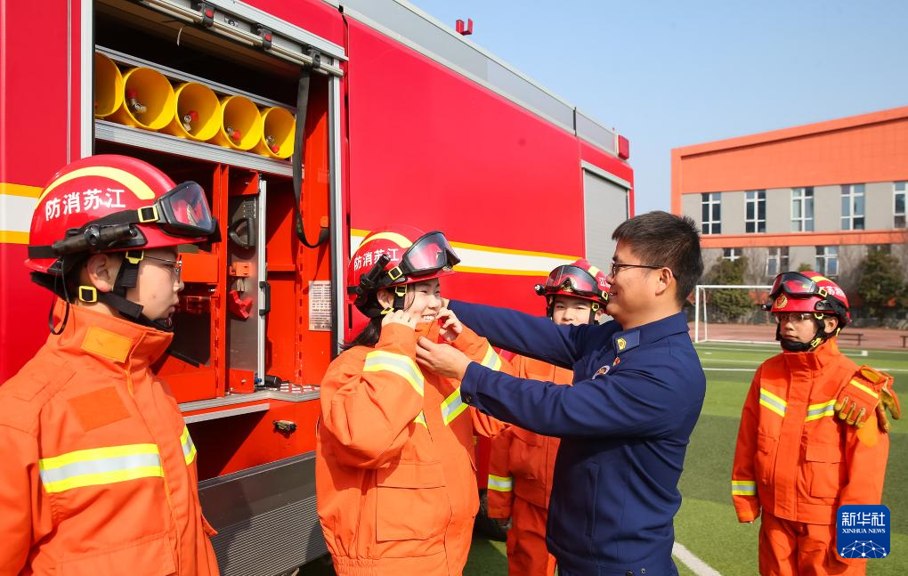 2月13日,在江苏省句容市葛村中心小学,学生在消防员的帮助下体验穿戴消防救援服。