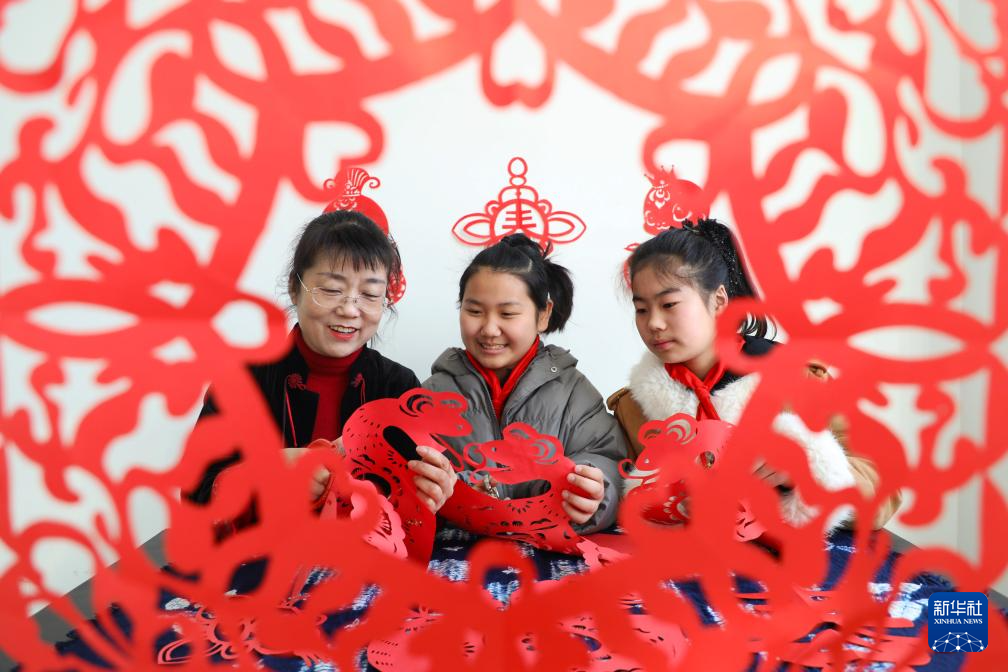 2月13日,在河北省唐山市丰润区火石营镇黄昏峪小学举行的“非遗进校园”开学第一课主题活动中,剪纸艺人葛英(左一)向学生传授剪纸技艺。