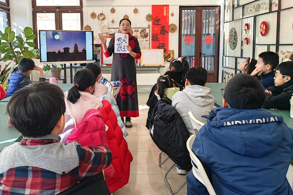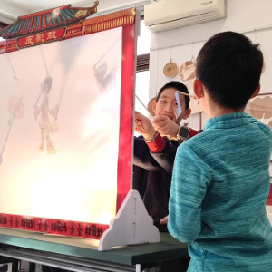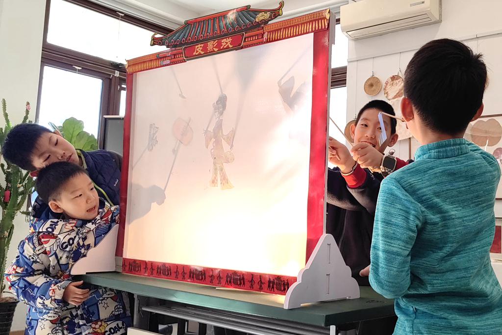 2月12日,老师在为小朋友讲解皮影戏的有关知识。