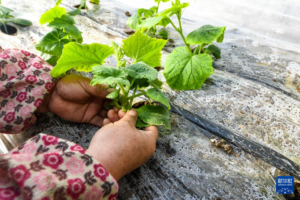 2月12日,在吉林市永吉县西阳镇兴隆川村大棚内,村民查看作物生长情况。