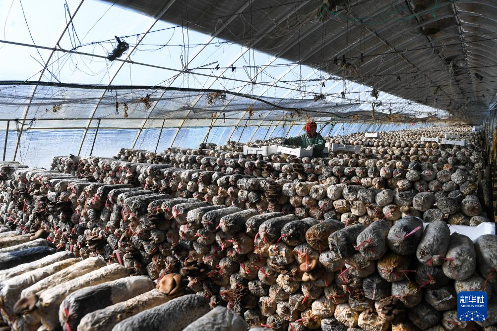 2月12日,在吉林市永吉县西阳镇兴隆川村大棚内,村民采摘食用菌。