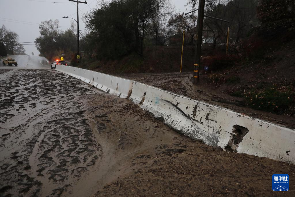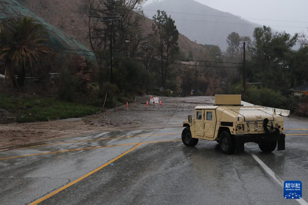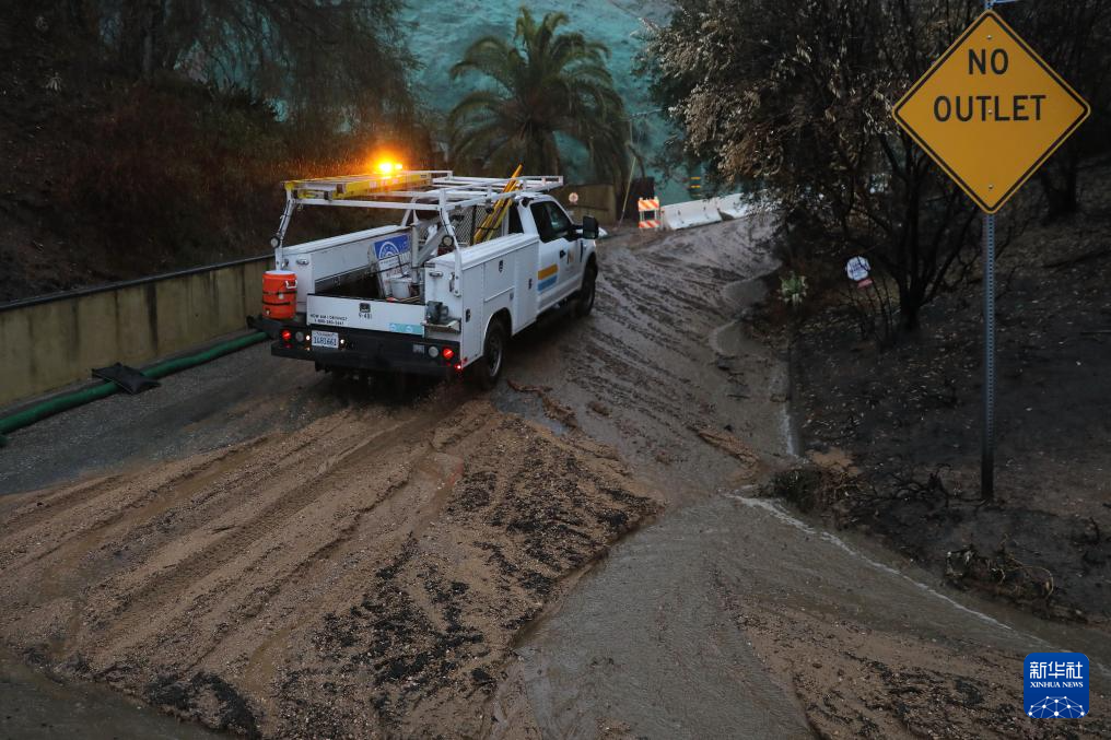 这是2月13日在美国加利福尼亚州洛杉矶县阿尔塔迪纳拍摄的遭遇强降雨的山火灾区。