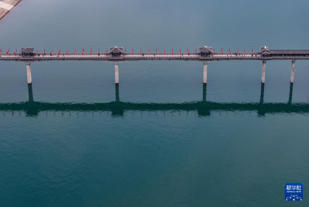 2月13日,游客在重庆奉节白帝城风雨廊桥游览(无人机照片)。
