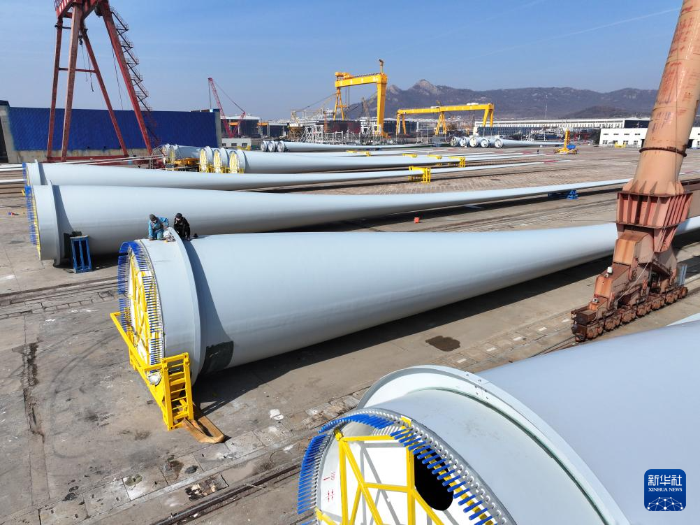 2月14日,山东省荣成市石岛湾畔的海上风电产业基地,工人抓紧组装超大规格风电叶片(无人机照片)。