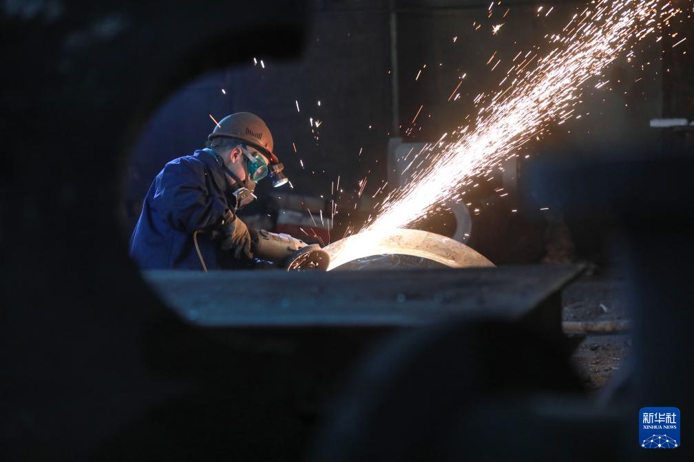 2月14日,在山东省青州经济开发区一家灌装设备制造企业,工人在车间内装配作业。