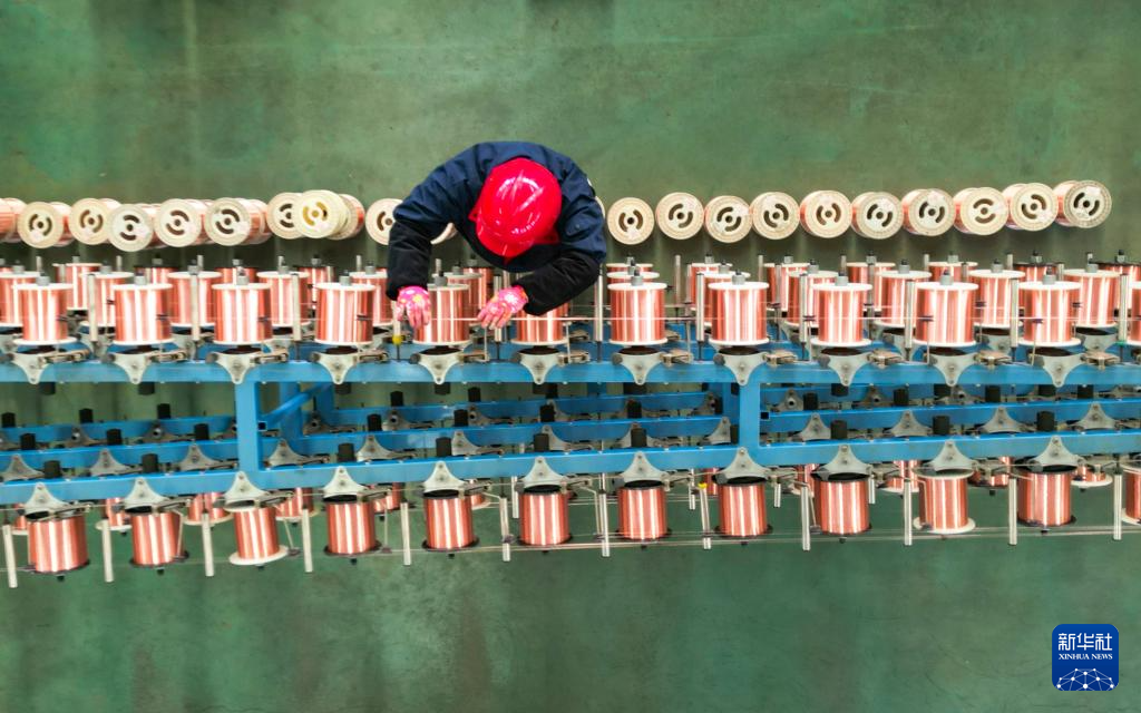 2月13日,在山东省东营市广饶县李鹊镇的一家电缆公司的生产车间内,工人在进行束丝作业(无人机照片)。