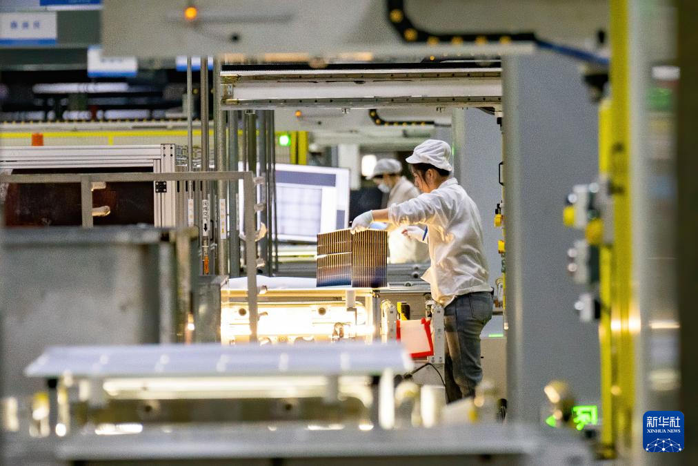 2月13日,在位于安徽省合肥市肥东县的合肥循环经济示范园内一光伏组件企业车间,工人在生产线上忙碌。