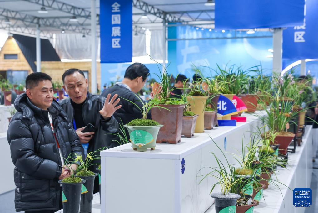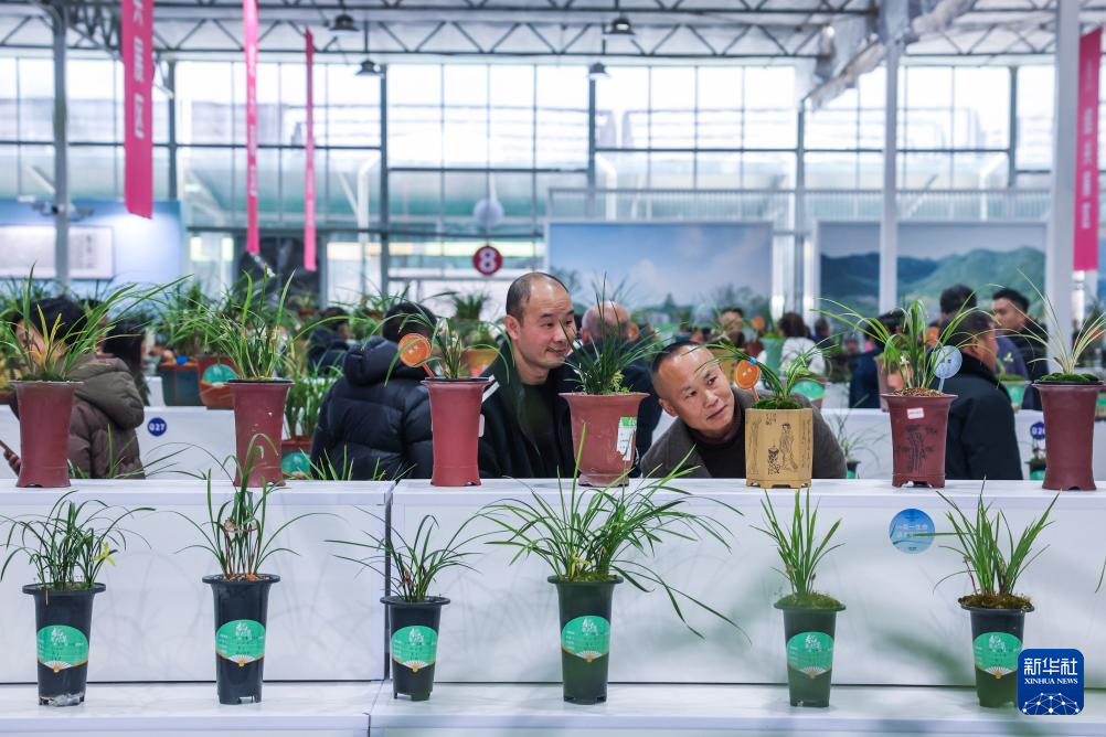 2月14日,观众在中国春兰大集上欣赏兰花。
