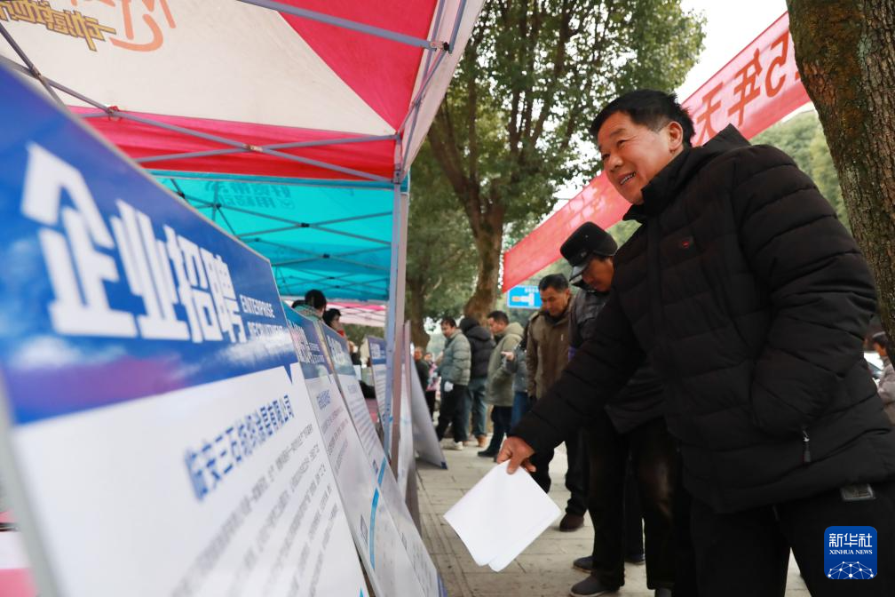 2月11日,在浙江省杭州市临安区天目山镇招聘会上,求职者在咨询工作岗位。