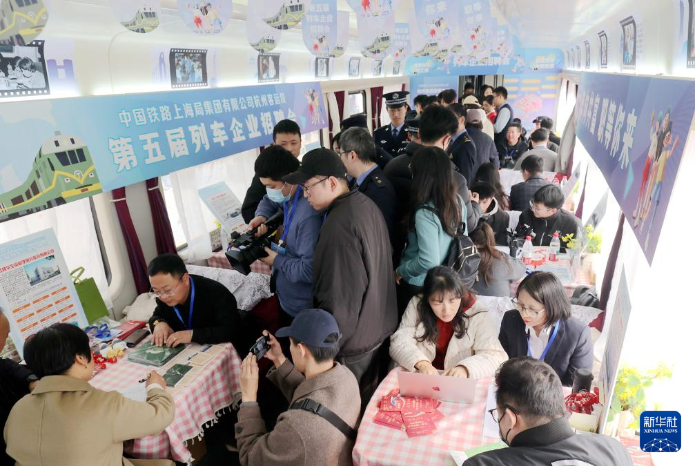 2月13日,浙江省总工会与杭州客运段在K210次列车上联合举办第五届列车企业招聘会,用人单位与求职人员进行现场交流。
