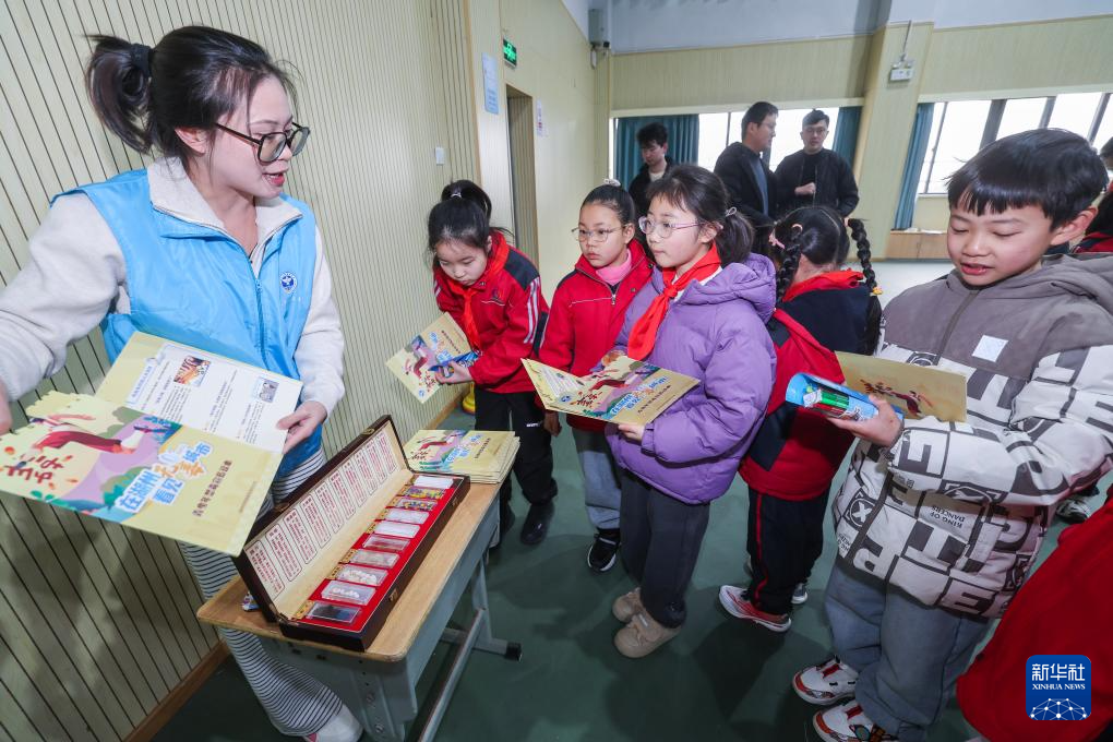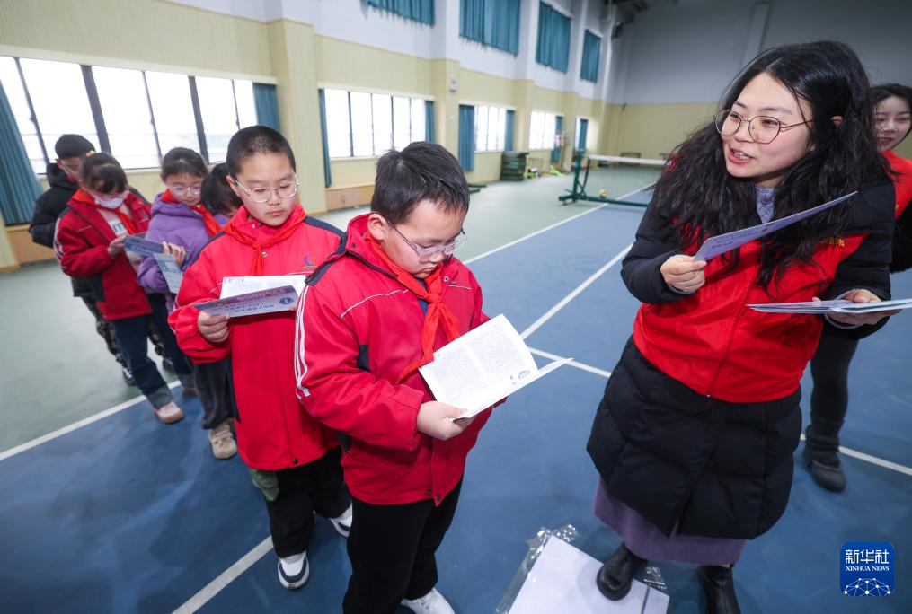 2月14日,龙泉街道潘公桥社区党员志愿者给学生们发宣传资料,普及日常防骗、反诈知识。