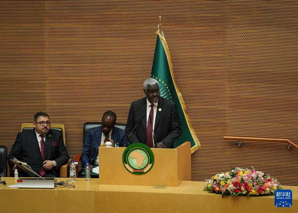 2月15日,在埃塞俄比亚首都亚的斯亚贝巴,非盟委员会主席法基在开幕式上发言。