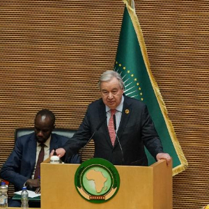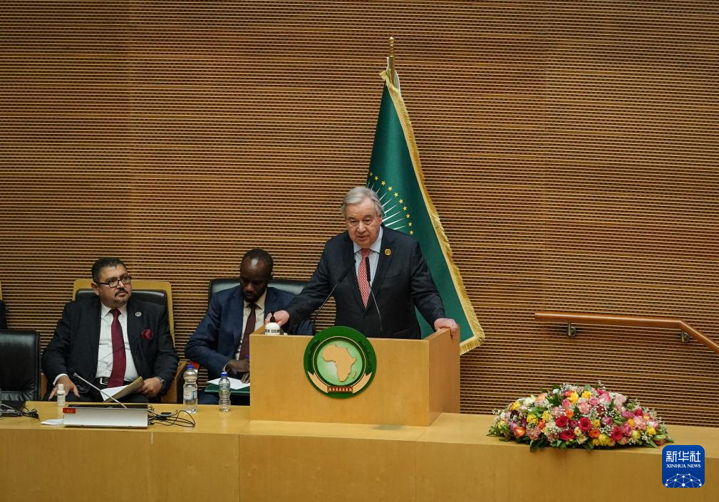 2月15日,在埃塞俄比亚首都亚的斯亚贝巴,联合国秘书长古特雷斯在开幕式上发言。