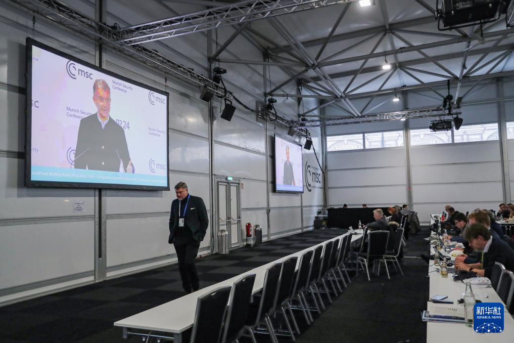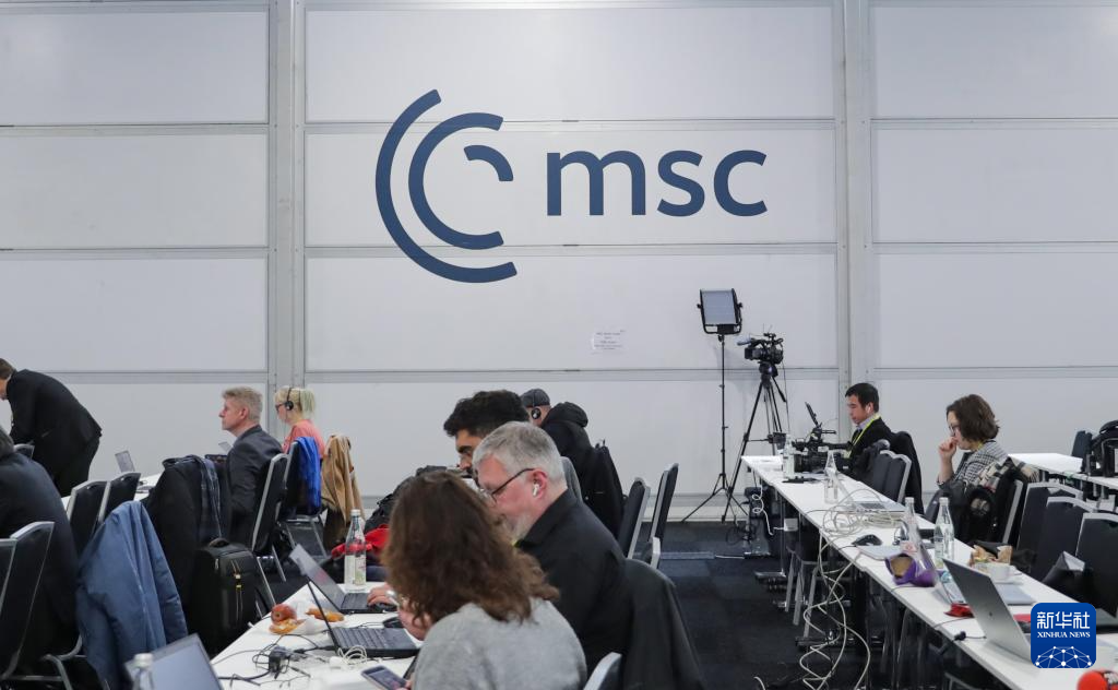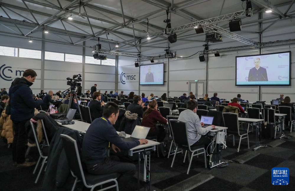 2月16日,在德国慕尼黑,媒体记者在慕安会新闻中心工作。屏幕上直播慕安会主席克里斯托夫·霍伊斯根的闭幕式致辞。