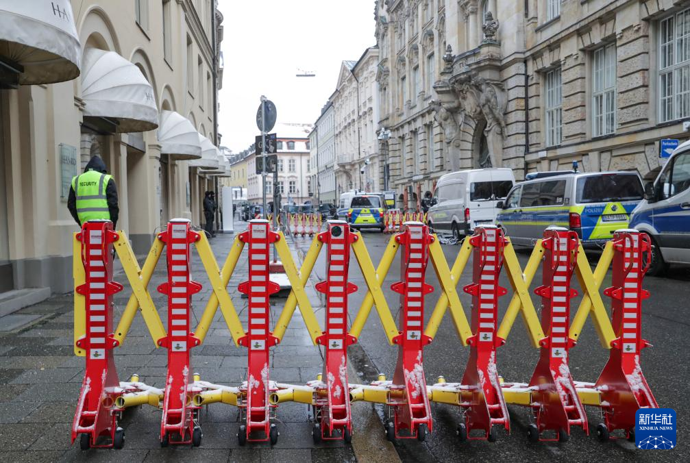 2月16日,在德国慕尼黑,安保人员封锁了举办慕安会酒店附近的道路。