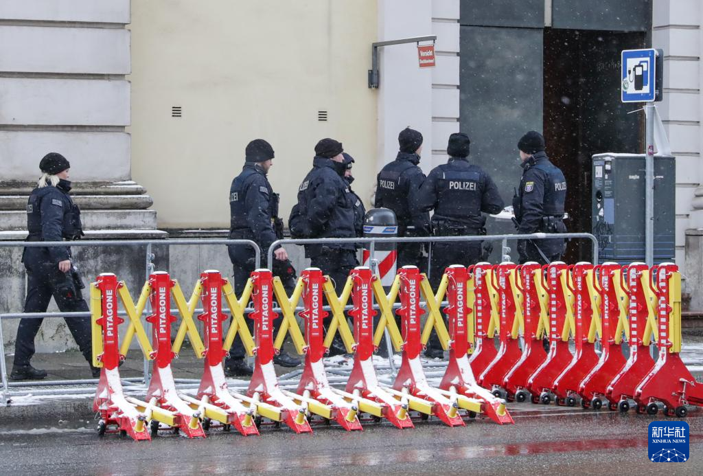 2月16日,在德国慕尼黑,警察在举办慕安会的酒店附近警戒。