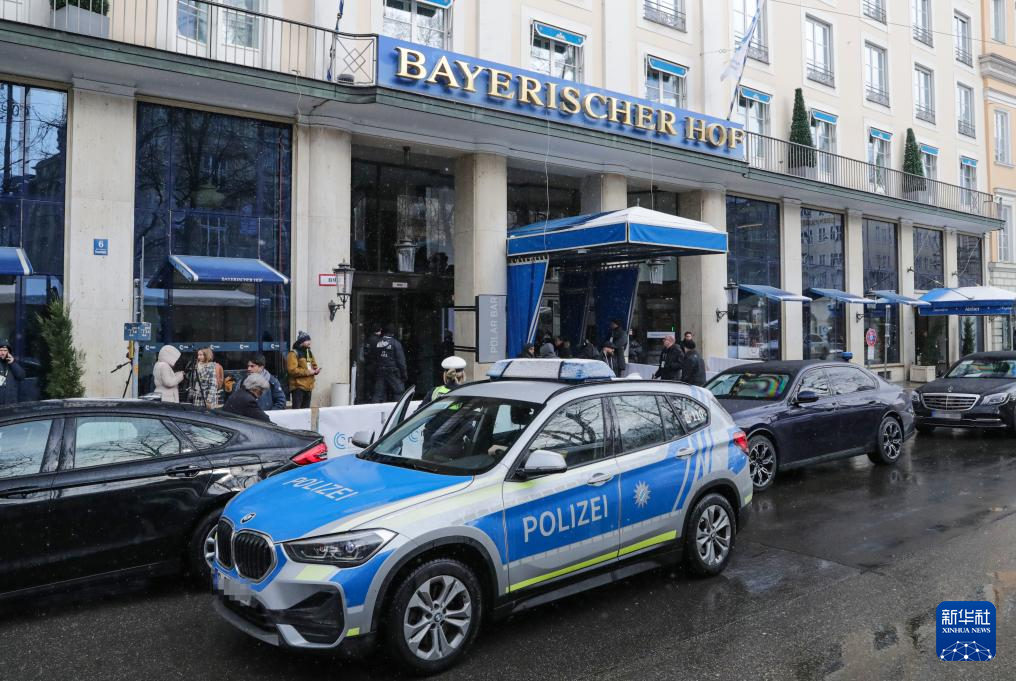 2月16日,在德国慕尼黑,一辆警车停在举办慕安会的酒店门口。