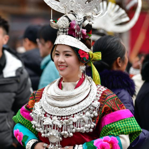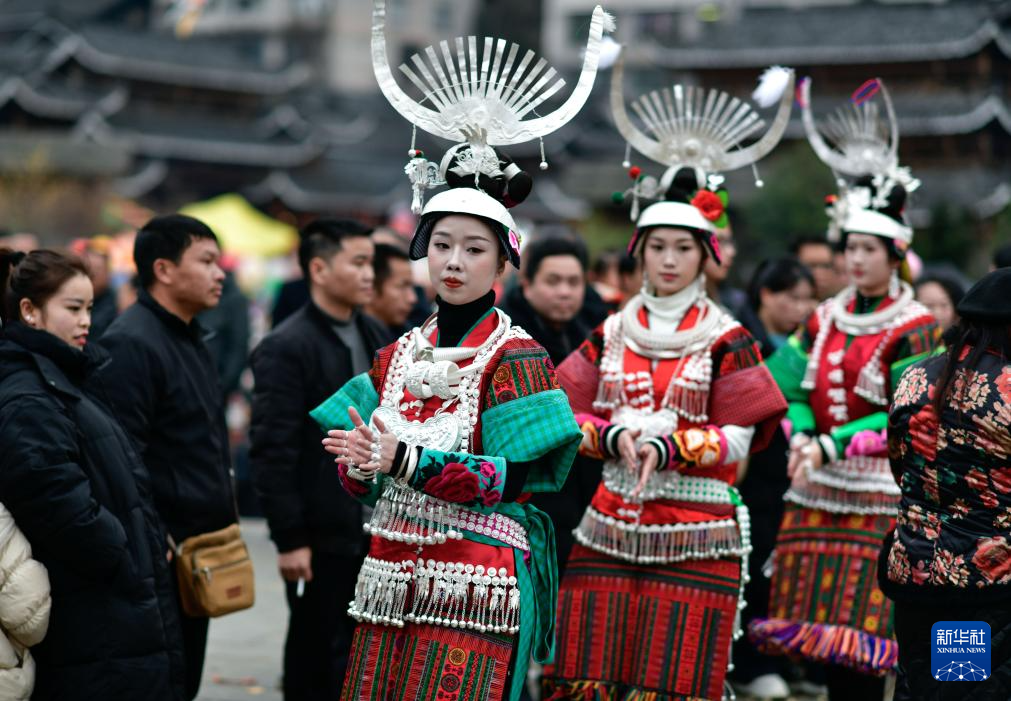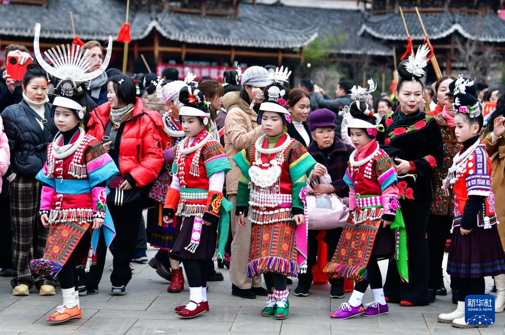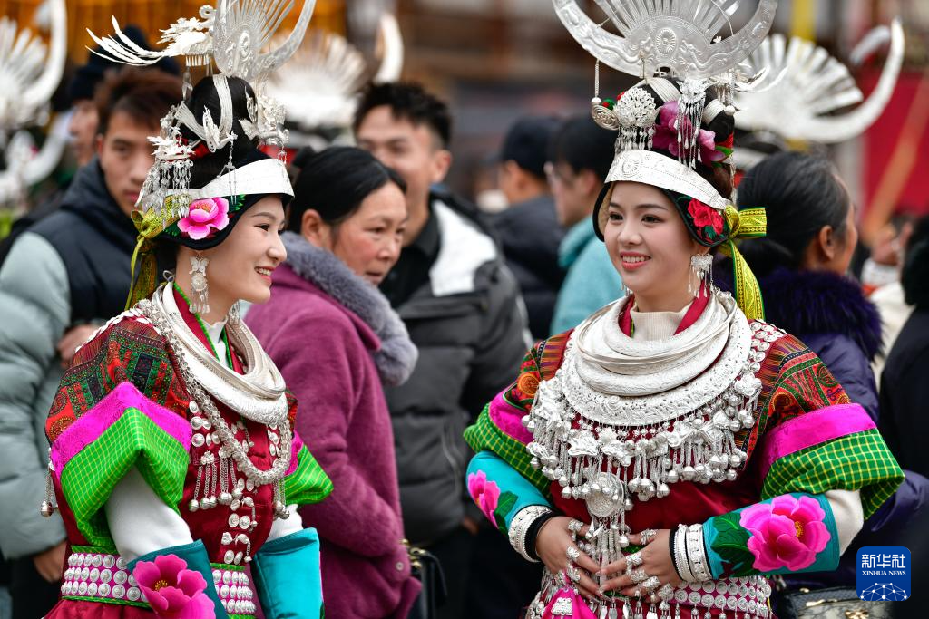 2月16日,在贵州省凯里市舟溪镇“甘囊香”芦笙堂,苗族姑娘身着盛装跳芦笙舞。