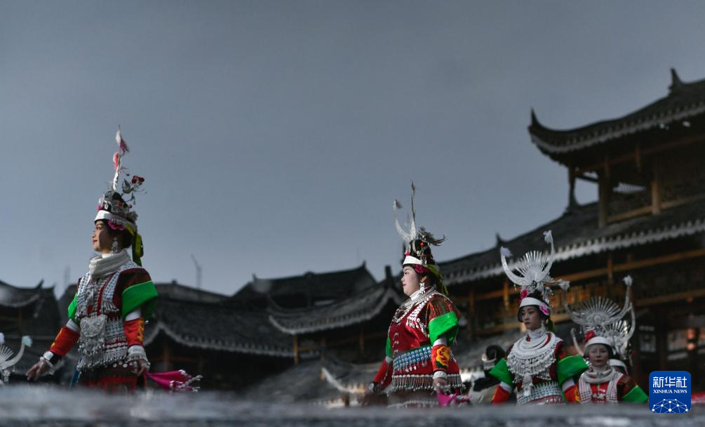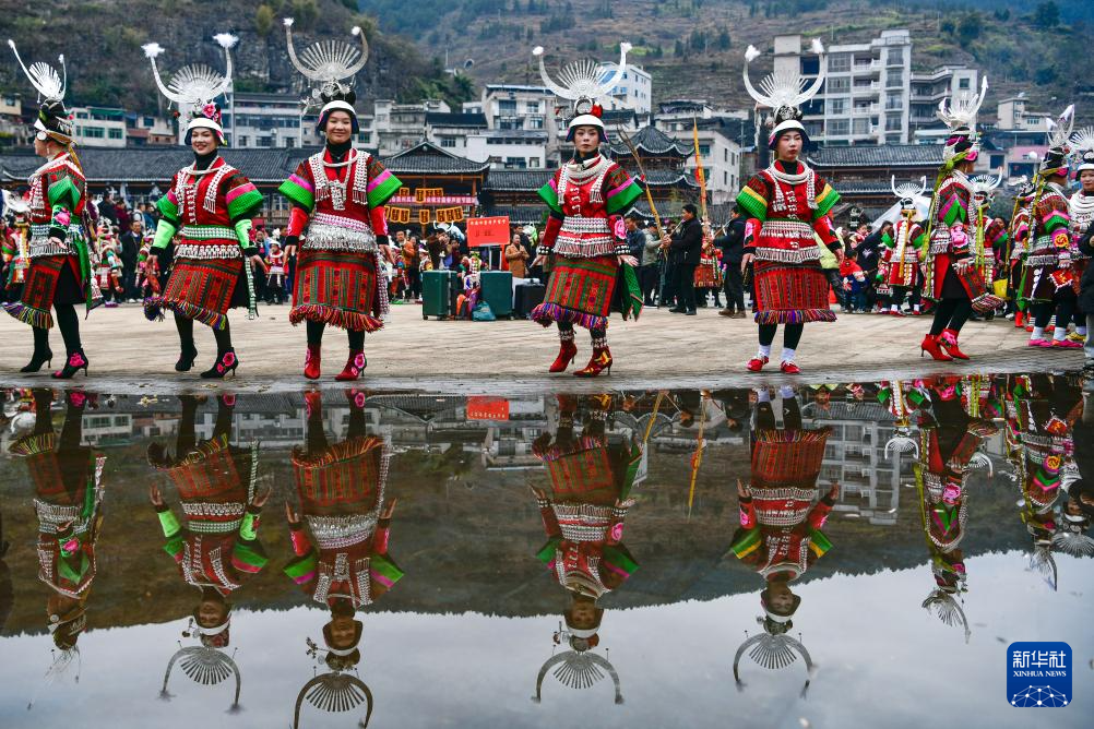 2月15日,在贵州省凯里市舟溪镇“甘囊香”芦笙堂,苗族姑娘身着盛装跳芦笙舞(照片翻转180度)。