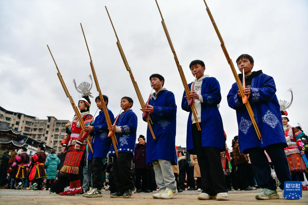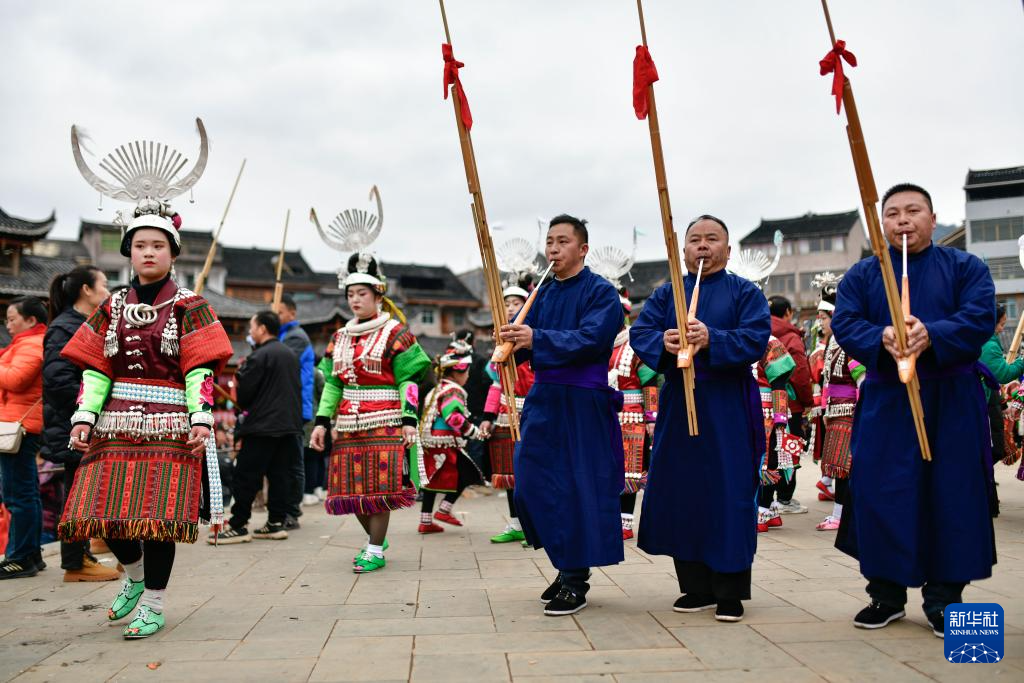 2月15日,在贵州省凯里市舟溪镇“甘囊香”芦笙堂,苗族群众在吹奏芦笙。