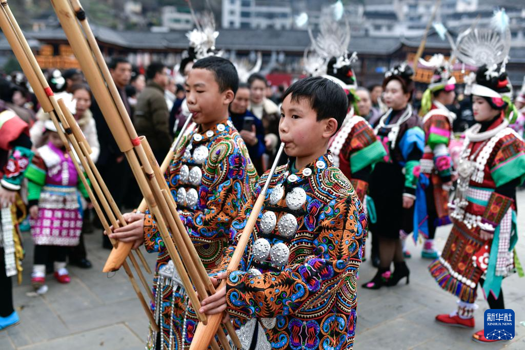 2月15日,在贵州省凯里市舟溪镇“甘囊香”芦笙堂,苗族孩子在吹奏芦笙。