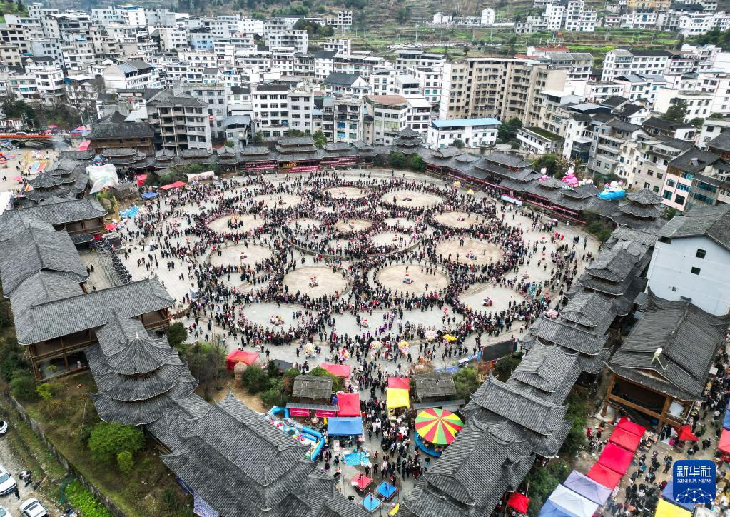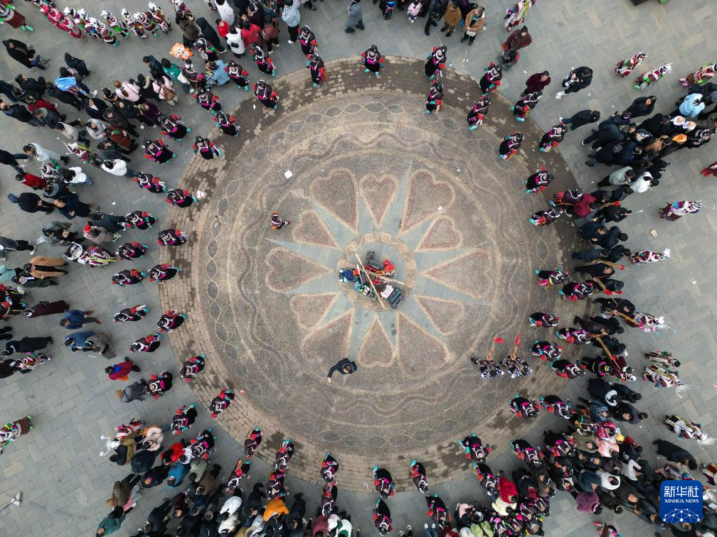 2月16日,在贵州省凯里市舟溪镇“甘囊香”芦笙堂,人们在跳芦笙舞(无人机照片)。
