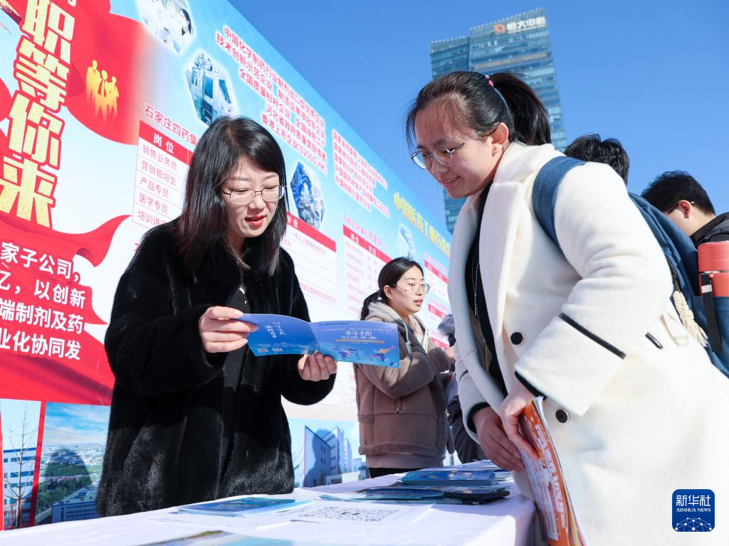 2月15日,在石家庄市解放广场举行的2025年河北省春季大型招聘会上,求职者向企业代表咨询就业岗位信息。