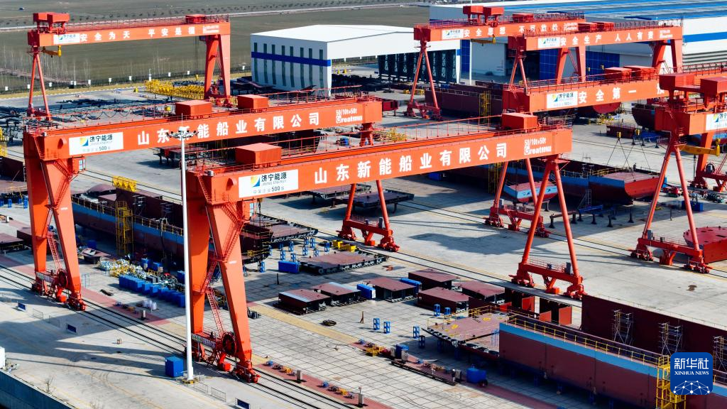 2月16日,在济宁能源集团山东新能船业有限公司,工作人员在船体搭载平台对新能源船舶进行组装作业(无人机照片)。目前,其新能源船舶订单已排满全年。