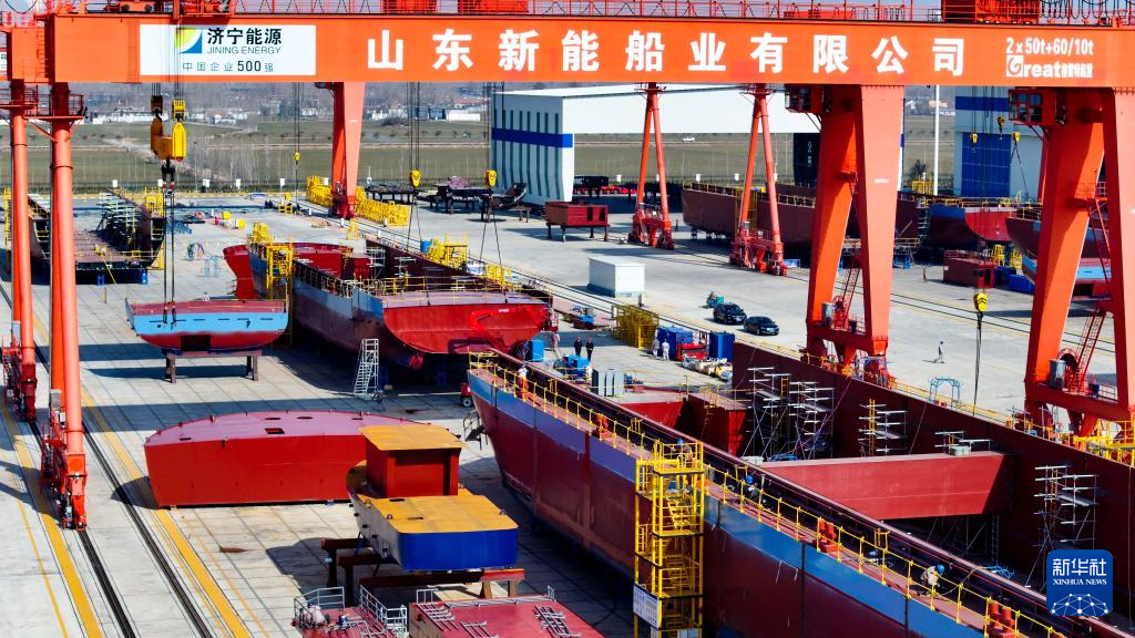 2月16日,在济宁能源集团山东新能船业有限公司,新能源船舶在进行舾装作业(无人机照片)。