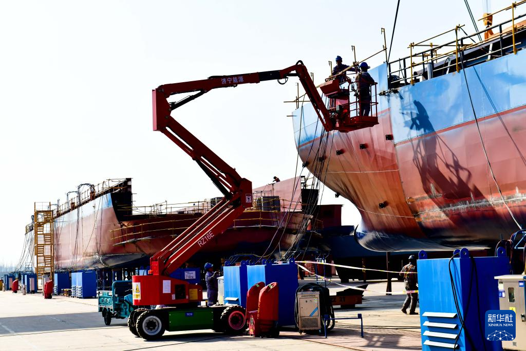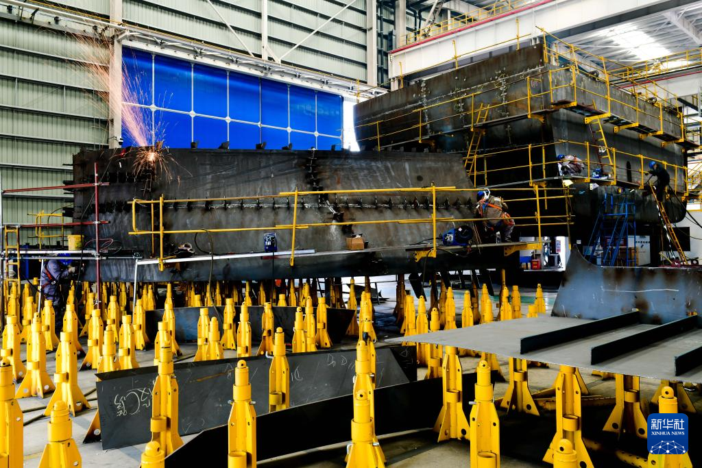 2月16日,在济宁能源集团山东新能船业有限公司,工作人员在船体搭载平台对新能源船舶进行组装作业。