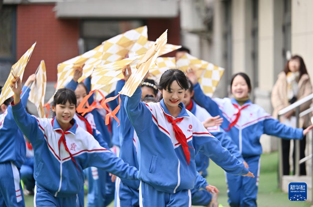 2月17日,在天津市和平区新星小学,学生们在开学典礼上表演节目。