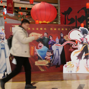 2月18日,在沈阳一家商场,顾客从电影《哪吒之魔童闹海》的宣传广告牌前经过。