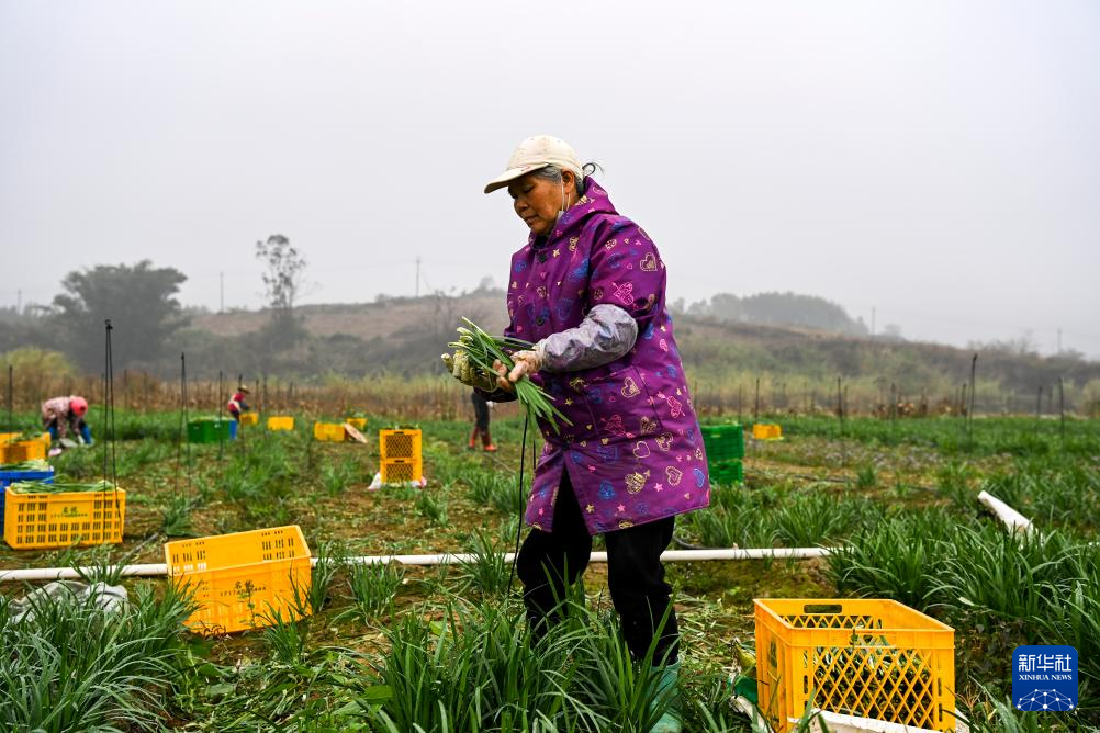 2月18日,广西兴业县一韭菜种植基地工作人员在采收韭菜。