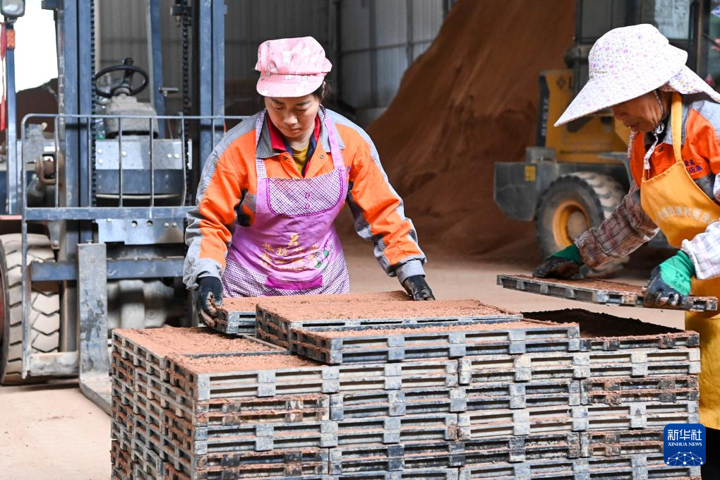 2月18日,在广西兴业县一家水稻育秧工厂,工作人员搬运配置好的秧盘。