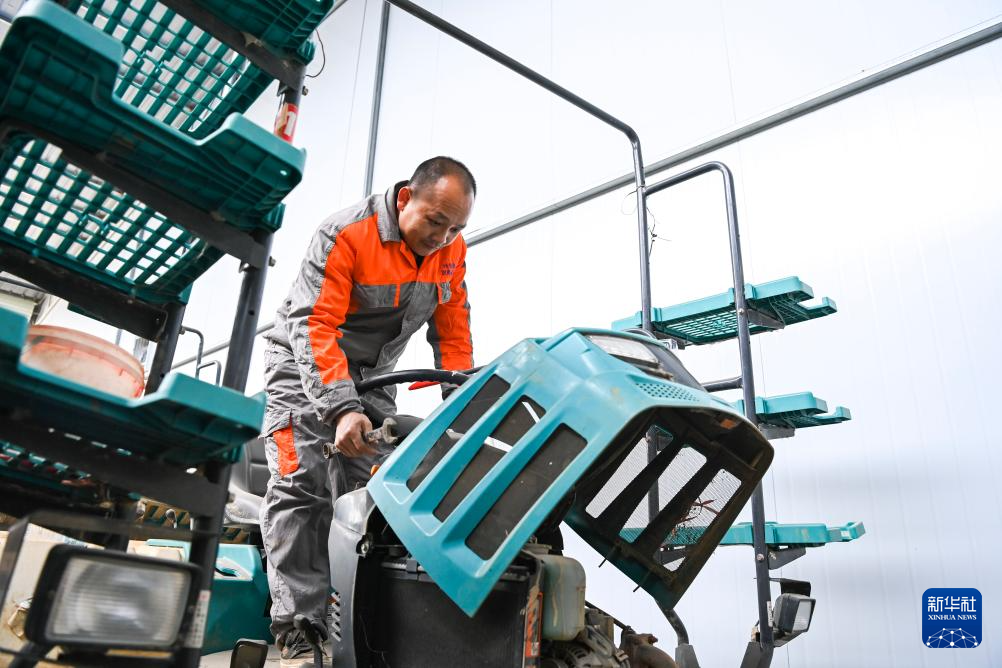 2月18日,在广西兴业县一家农机工厂,工作人员检修播秧机。