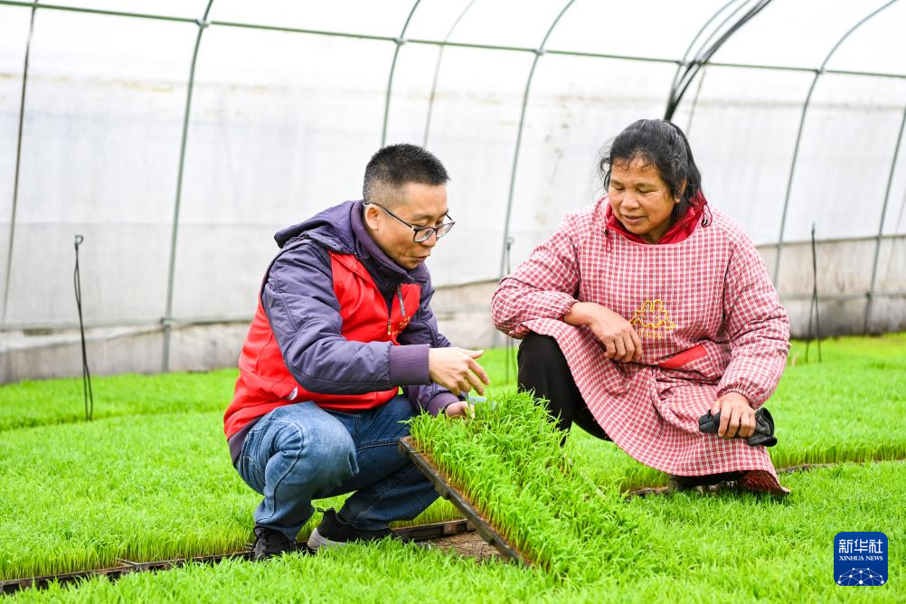 2月18日,在广西兴业县一处水稻育秧大棚,县里的农技人员(左)与村民一起检查秧苗的生长情况。