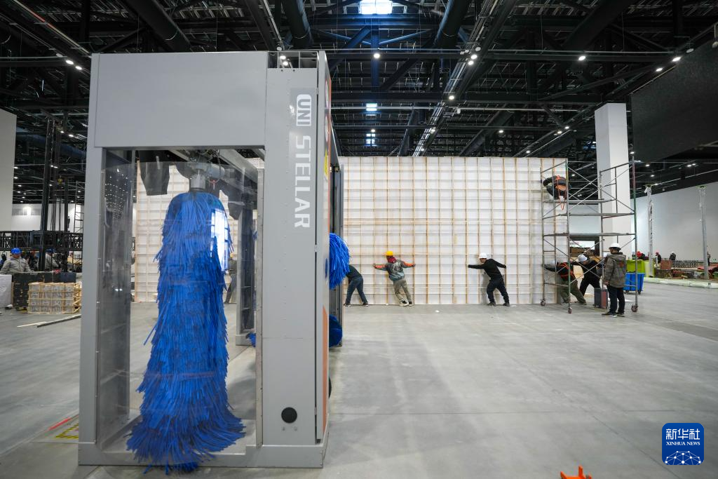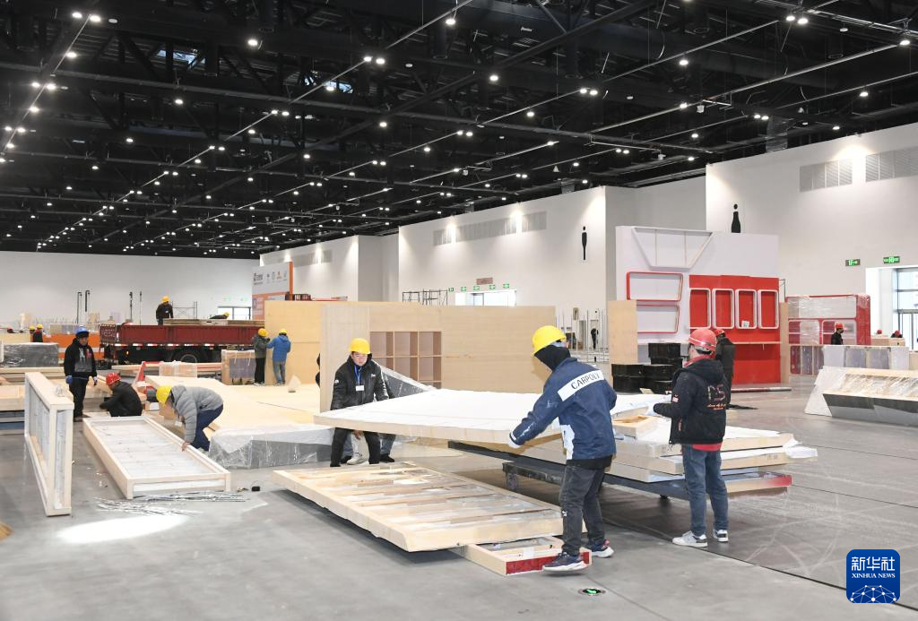 2月19日,工作人员在首都国际会展中心内布展。