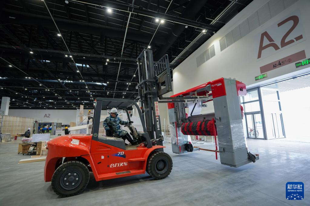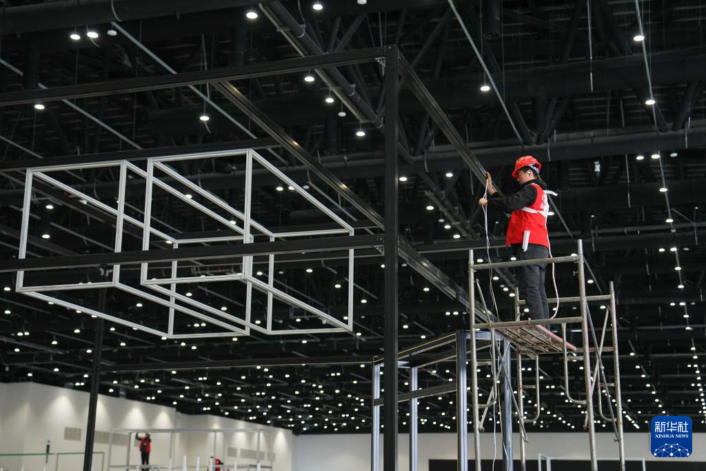 2月19日,工作人员在首都国际会展中心进行布展。