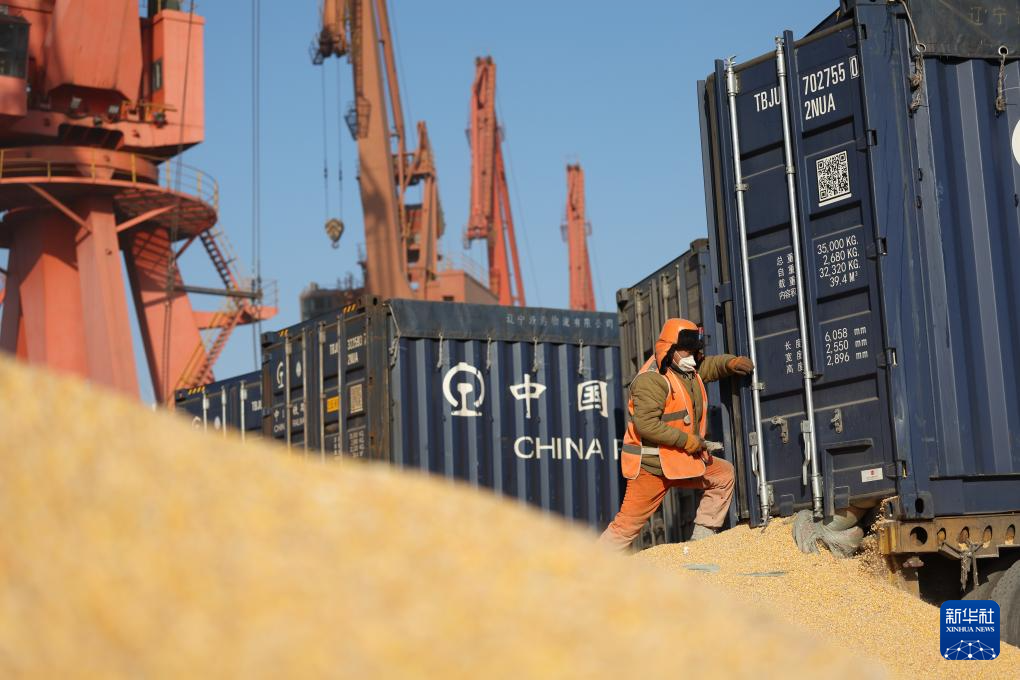 2月18日,在营口港鲅鱼圈港区,装满玉米的敞顶箱在码头卸货。