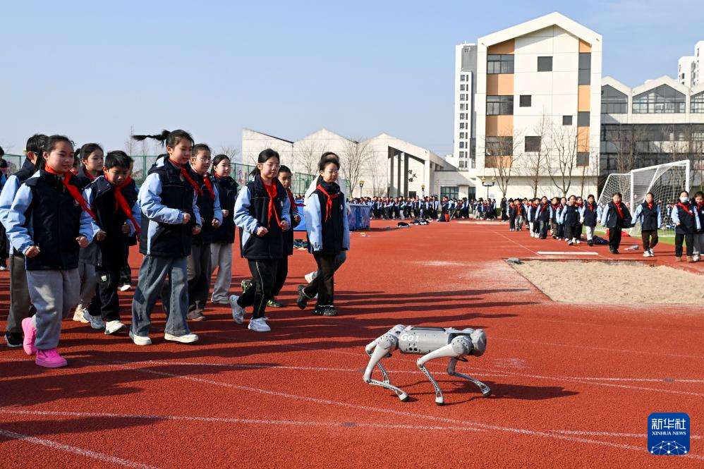 2月19日,在江苏省昆山市信义小学,机器狗带领学生在大课间活动跑步。