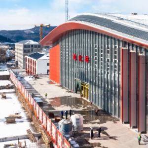 2月18日,在通化站建设现场,施工人员的影子映照在突显当地冰雪文化元素的“雪花”外墙装饰上。