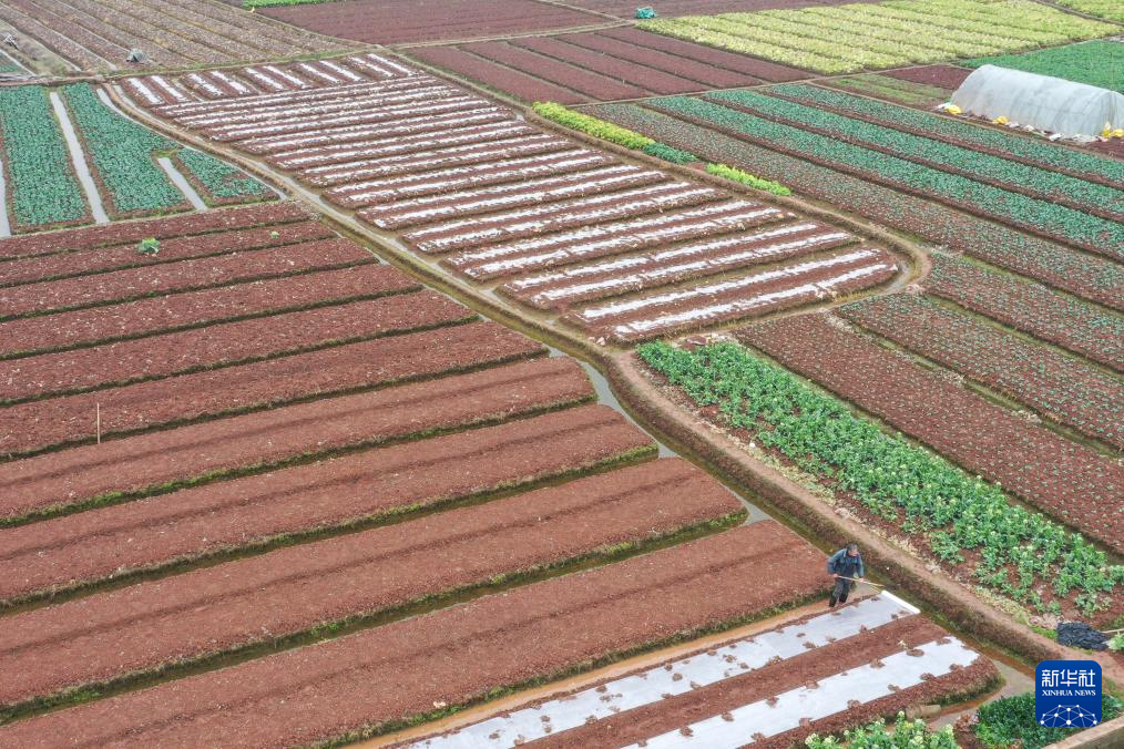 2月18日,在湖南省衡阳县西渡镇振兴村,农民在给刚种植的蔬菜覆膜(无人机照片)。