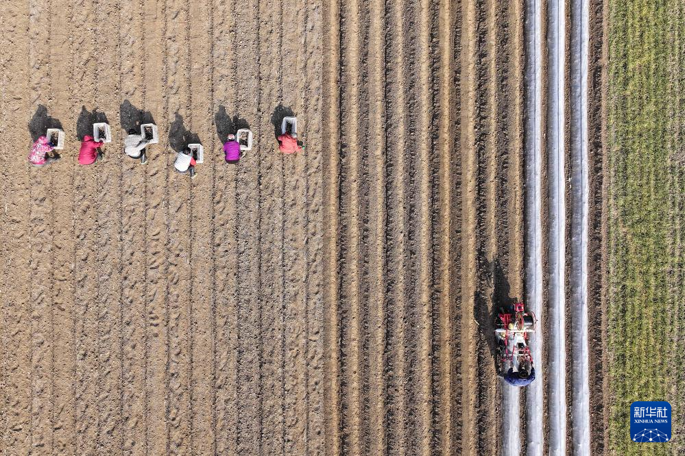 2月18日,在山东省临沂市郯城县郯城街道一处蔬菜种植基地,农民使用农机播种“订单土豆”(无人机照片)。