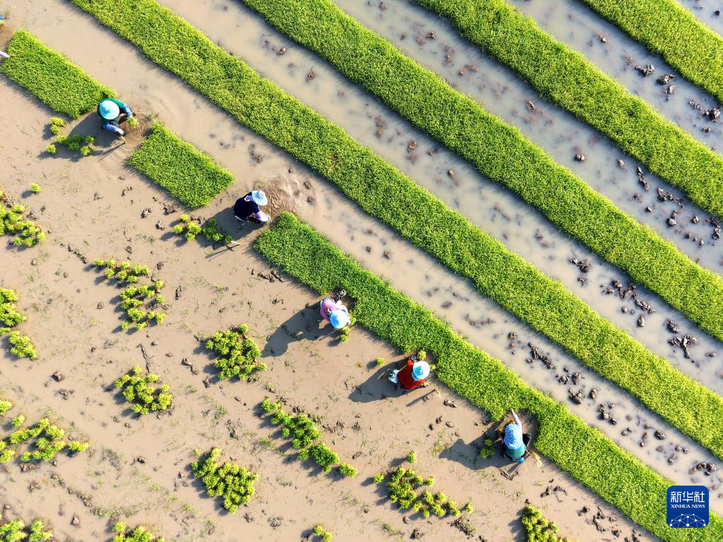 2月18日,在云南省西双版纳州勐海县勐遮镇曼拉村,农民在田间起秧(无人机照片)。