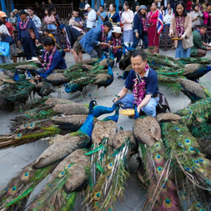 2月19日,游客在西双版纳一景区与孔雀互动。