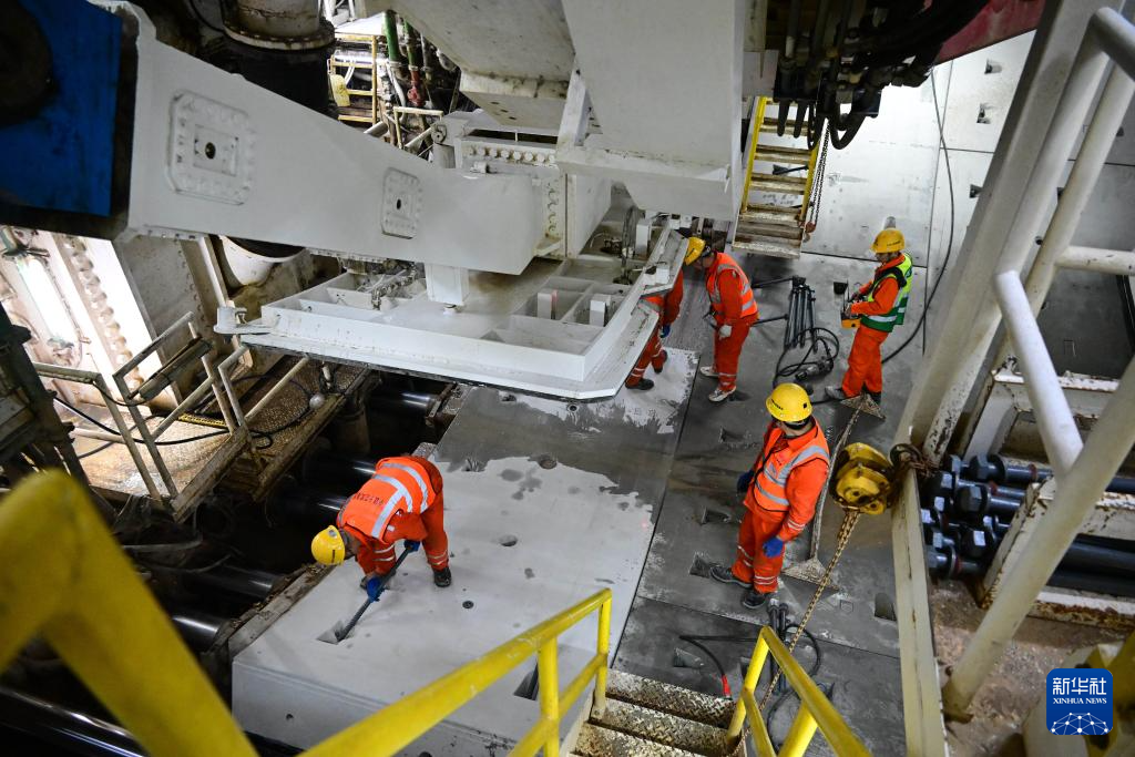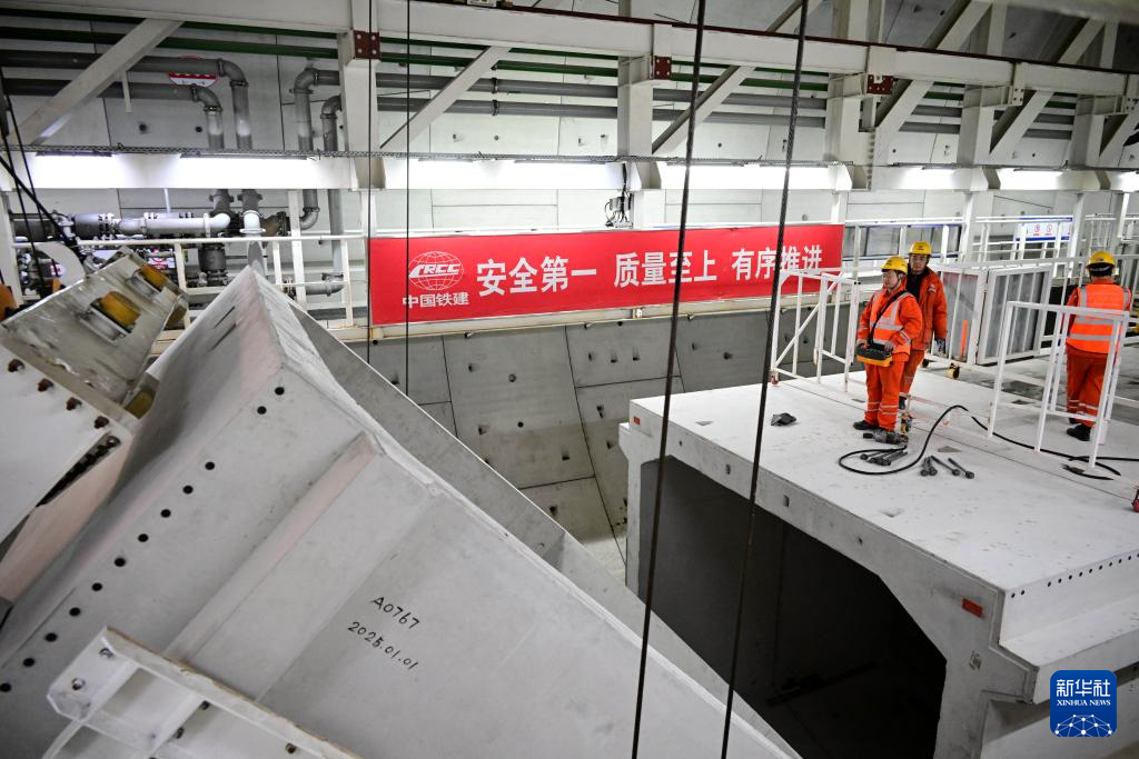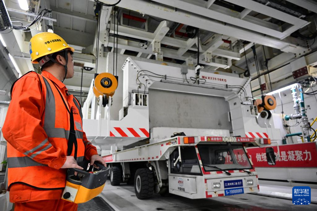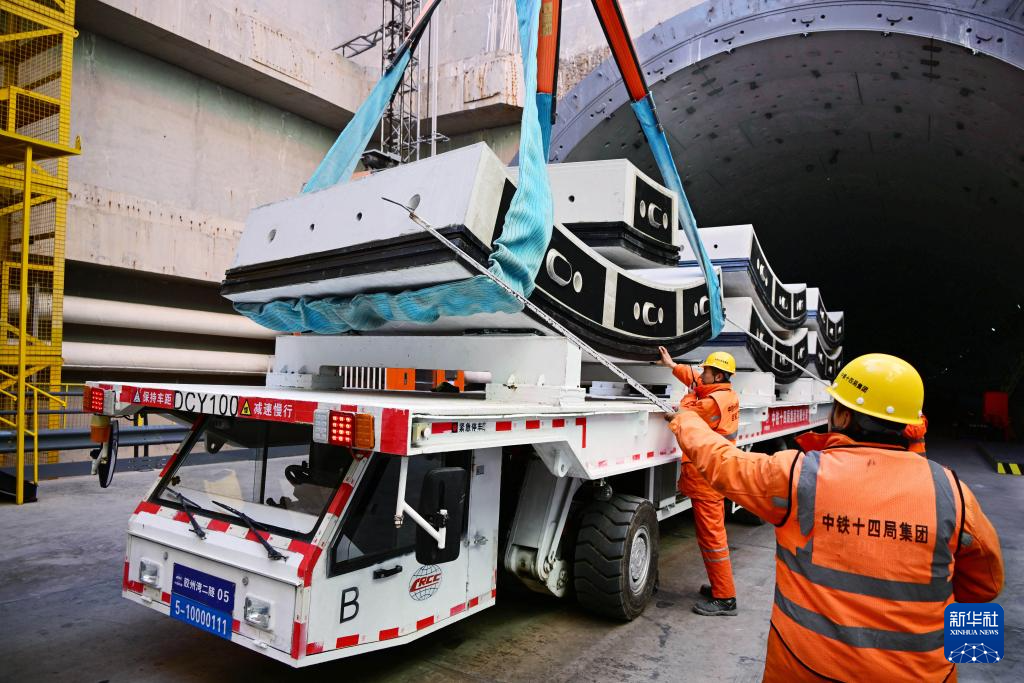 2月19日,青岛胶州湾第二隧道工程南线主隧道盾构段,中铁十四局建设者在进行箱涵拼装作业。